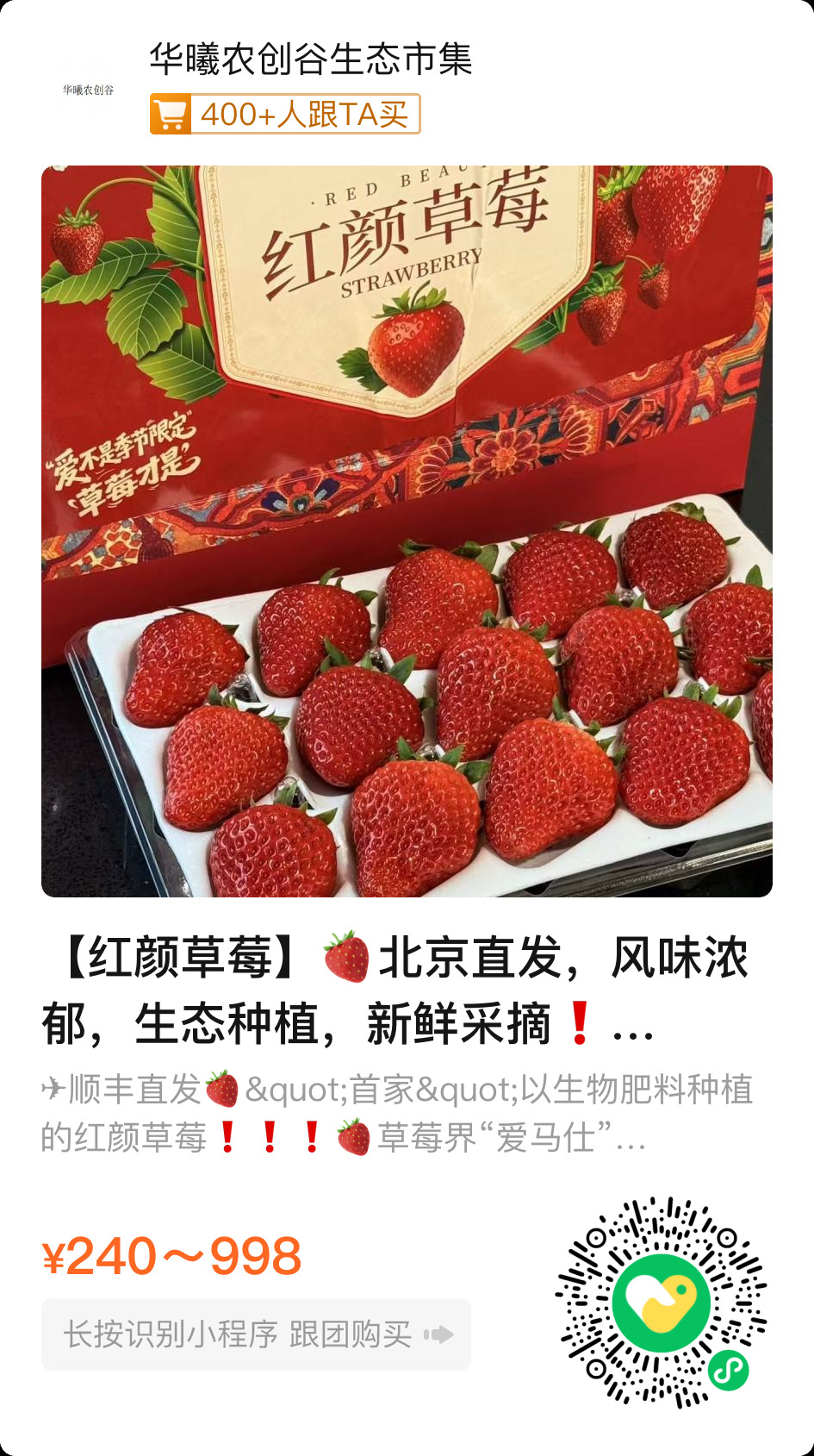 工作人员介绍说,红颜草莓已正式入驻快团团平台华曦农创谷生态市集店铺,为广大消费者搭建起便捷的线上选购渠道。其中,红颜草莓系列至尊果作为核心主打产品,均经过严格筛选分级,单颗重量稳定超过 50 克,果形规整、果肉紧实。